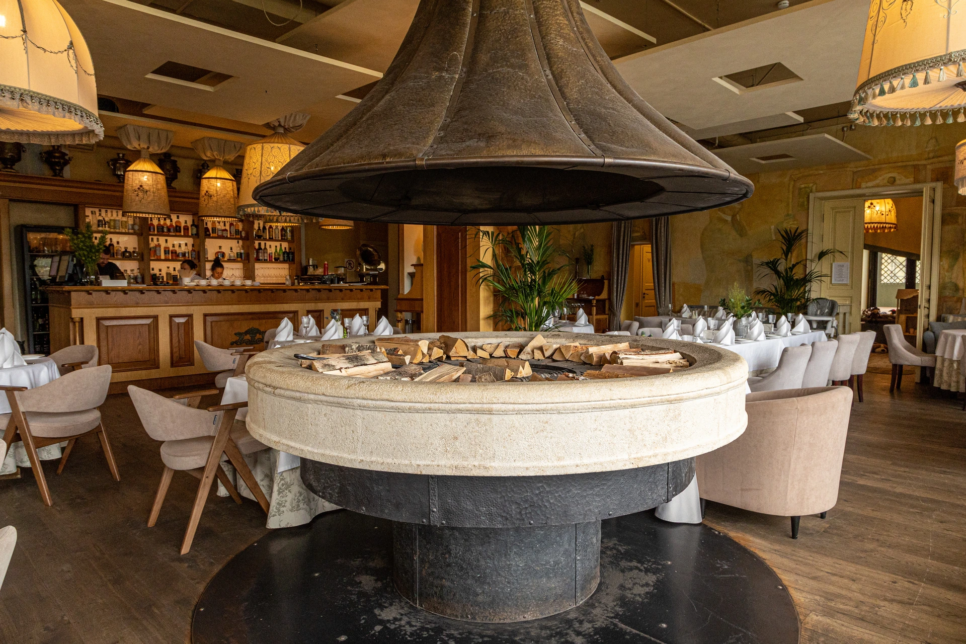арт-объекты вроде камина в виде граммофона в центре зала. Большая веранда, оформленная зеленью и цветами,